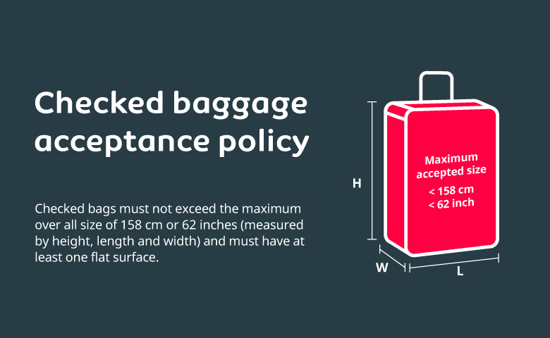 Each checked bag must not exceed 32 kg and 158 cm (62 inches) in total dimensions (length + width + height).